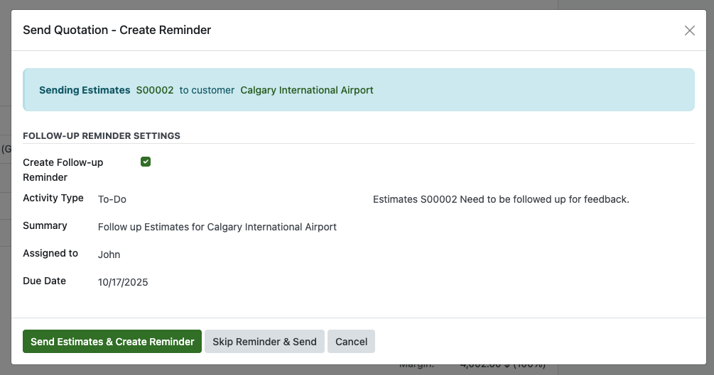 A Send Quotation Reminder pop-up will appear. This pop-up allows you to set a follow-up reminder after sending the email, but it is optional and can be skipped if you don’t need it.