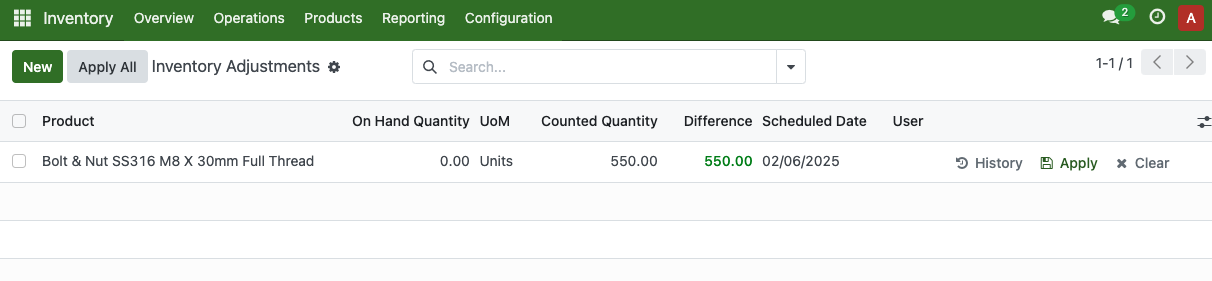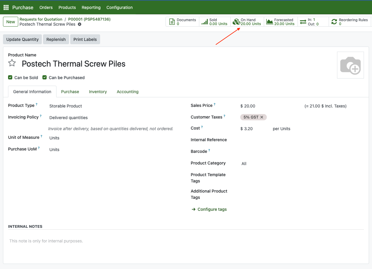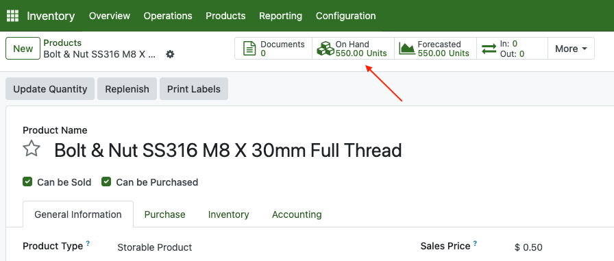 If you go to the product, you can see the On-Hand quantity will show based on how much the quantity is inputted.