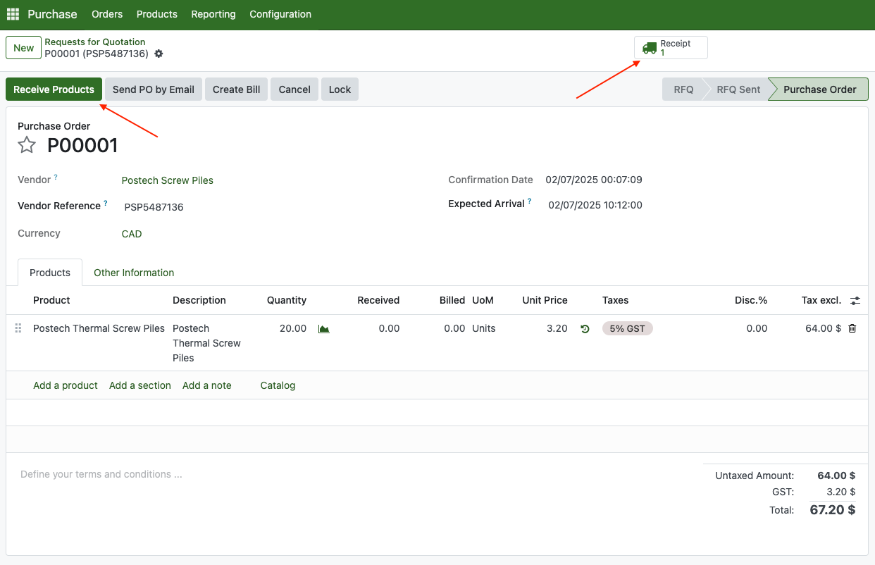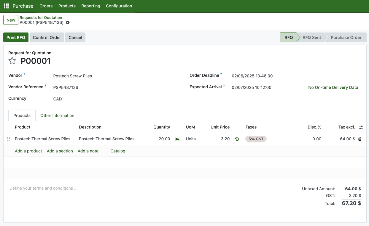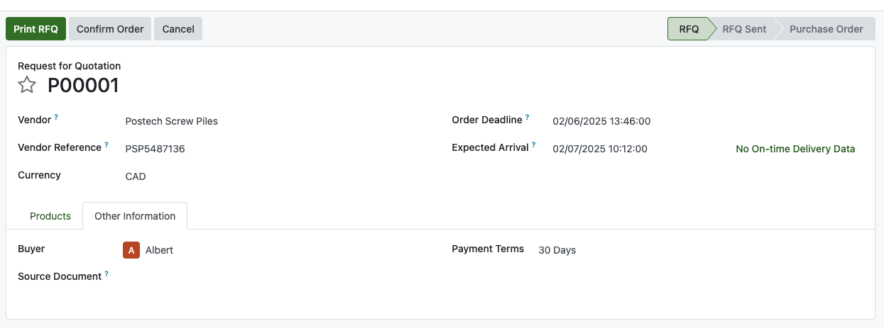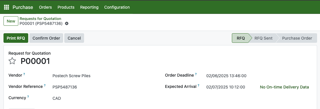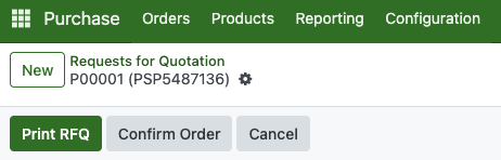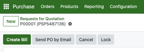 Creating a Purchase Order (PO) is straightforward. You can convert an existing RFQ into a PO by clicking Confirm Order.