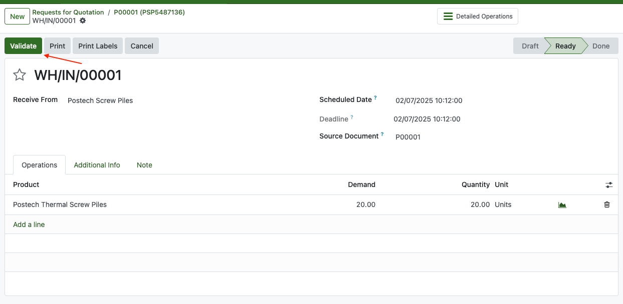 This is the receiving order. If you’re receiving only part of the order, simply adjust the quantities and click Validate. If everything matches the delivery, just click Validate to confirm receipt.