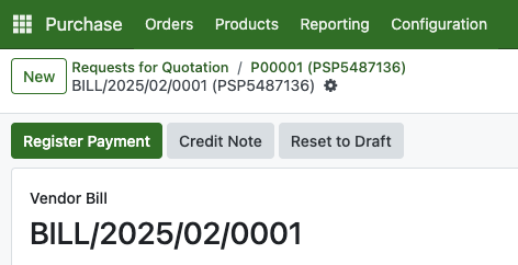 After receiving the products, you need to create a payment for the vendor. This process is called Creating a Vendor Bill. Go to the Purchase Order (PO) and click the Create Bill button in the header.