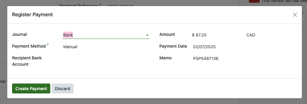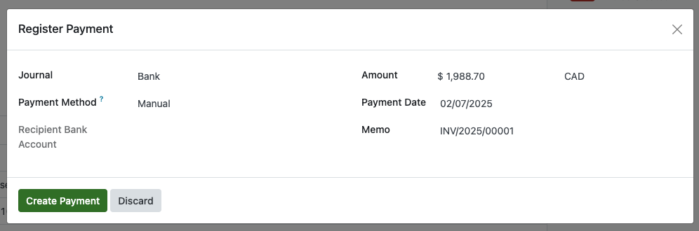 Enter the full payment amount and the payment date. If the customer is paying partially, enter the exact amount they are sending. Then, click Create Payment to continue.