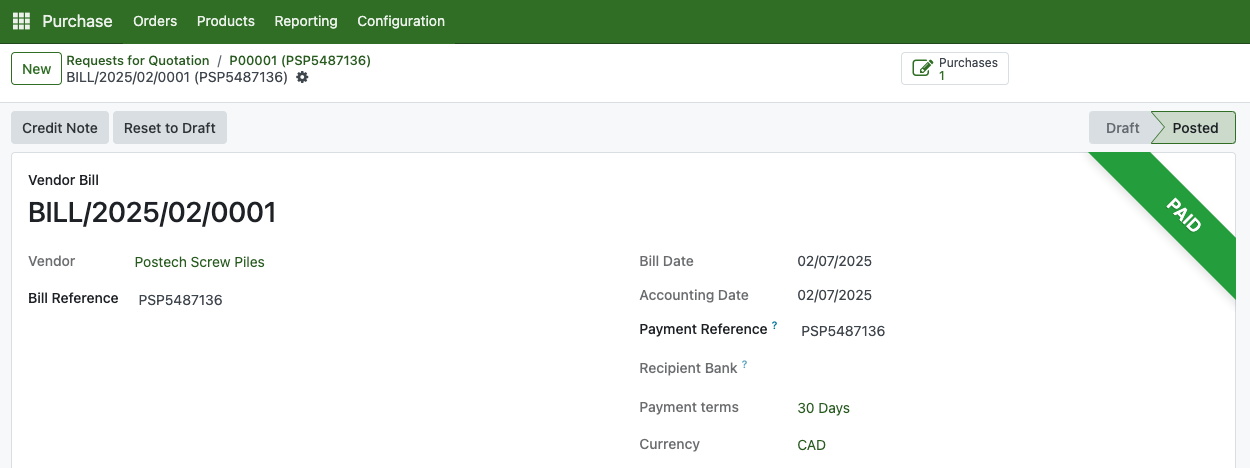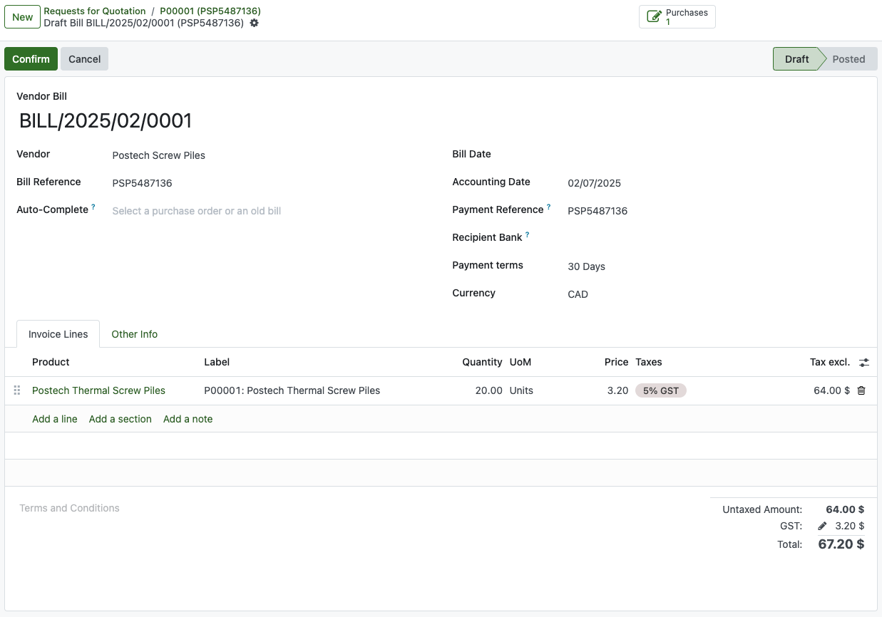 You will be redirected to a new record called Vendor Bill. Set the Bill Date, and then click Confirm.