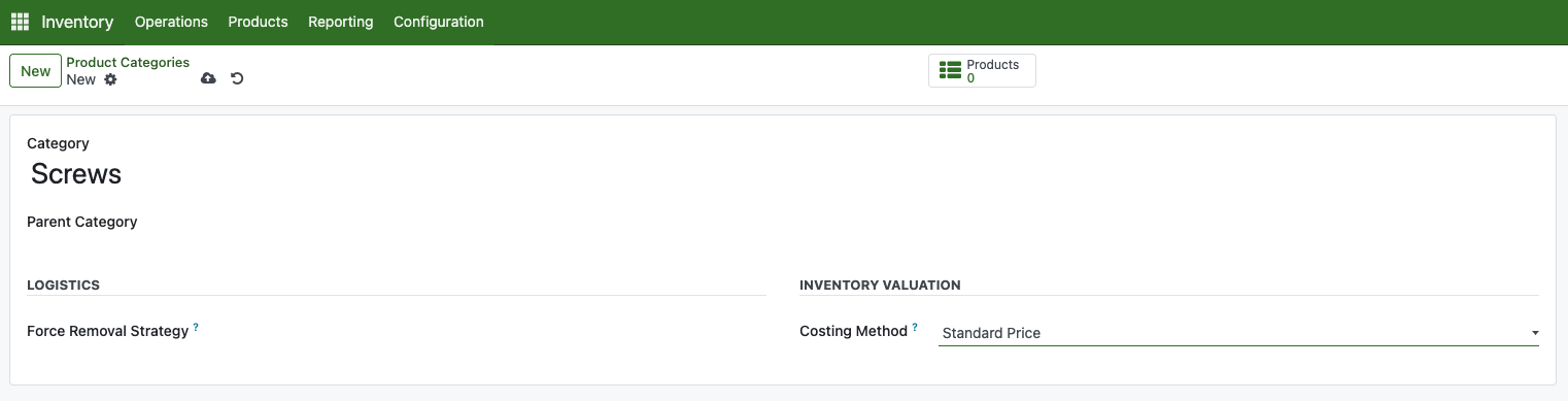 To create one, go to Inventory > Product Categories and click New, then enter the name of the category.