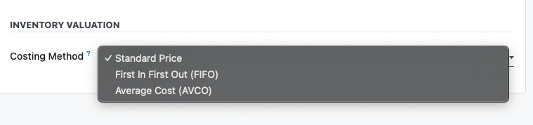 Next, you’ll need to set the costing method for inventory valuation. This determines how the value of each product and your total stock is calculated. You can choose between Standard Price, FIFO, or AVCO. For simplicity, we recommend using Standard Price.