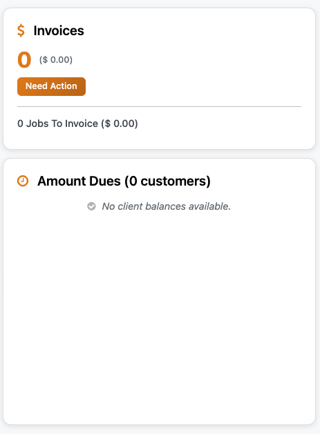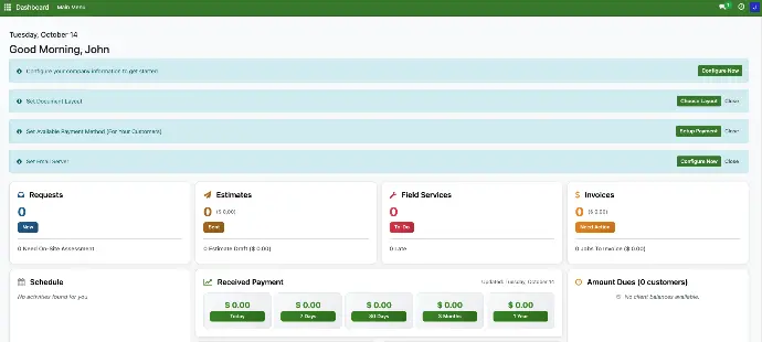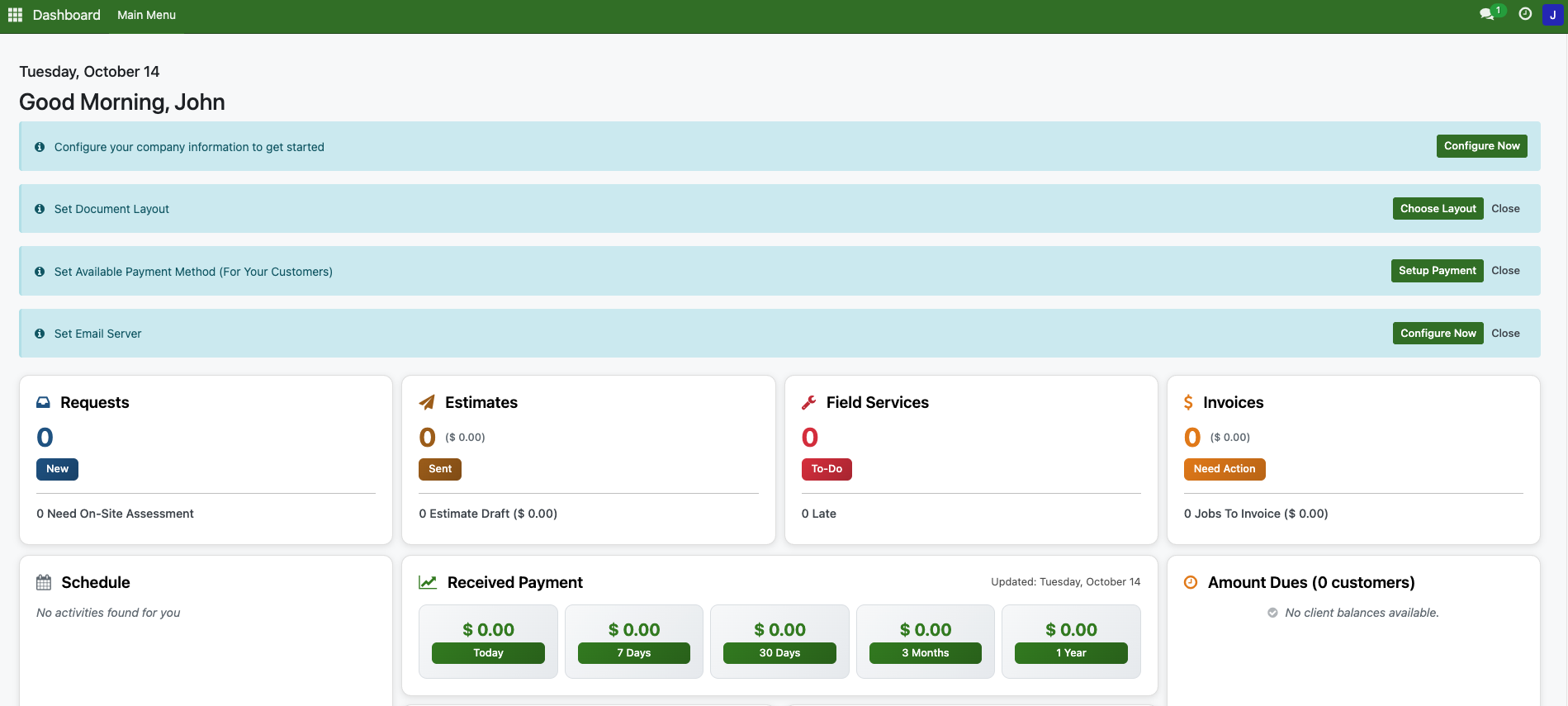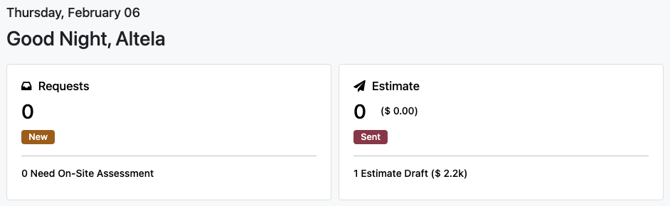 This is your website’s dashboard. From here, you can monitor all your projects and estimates, manage field services, and keep track of inventory items that need your attention.
