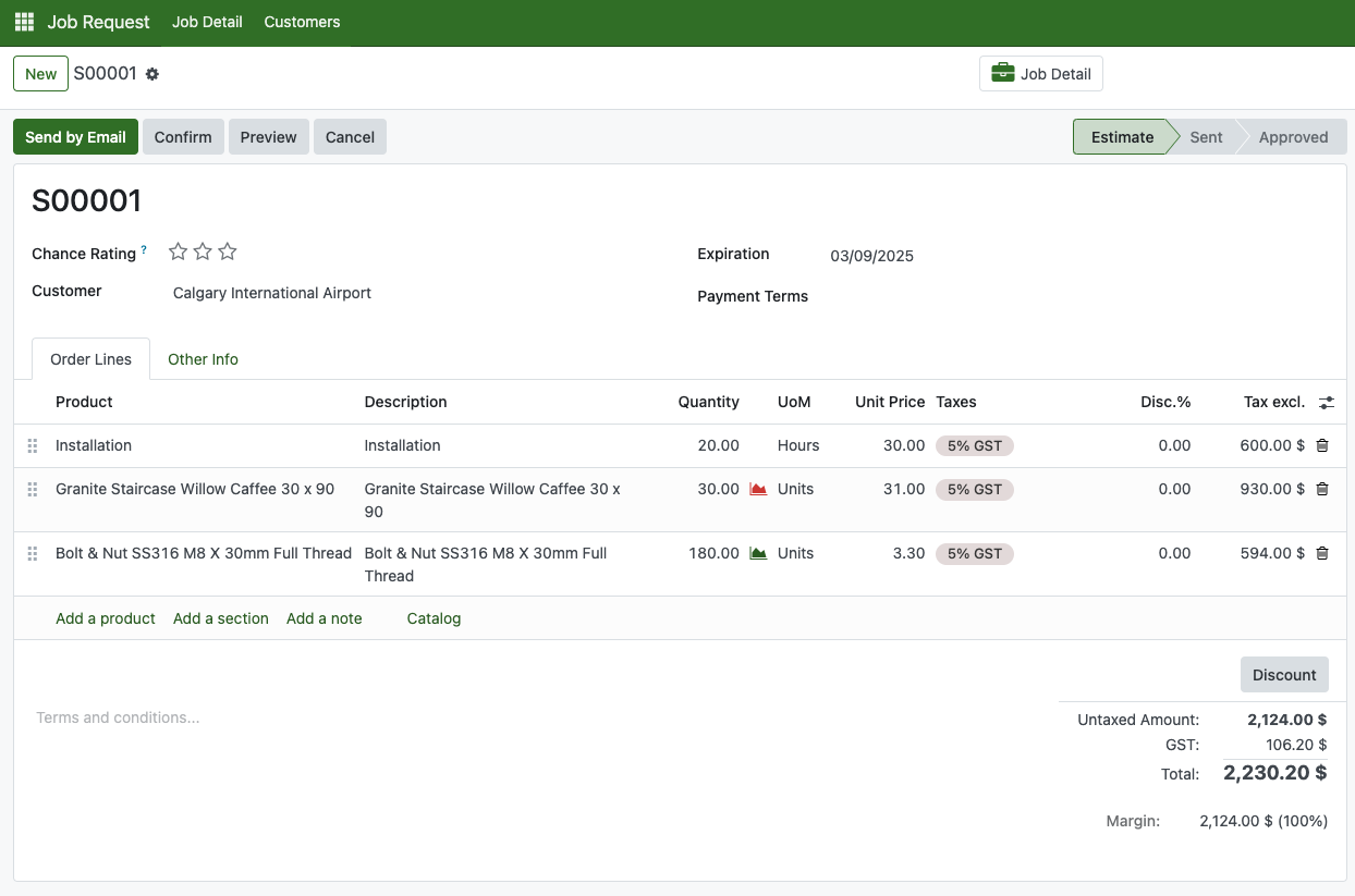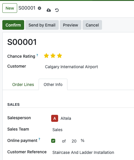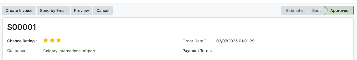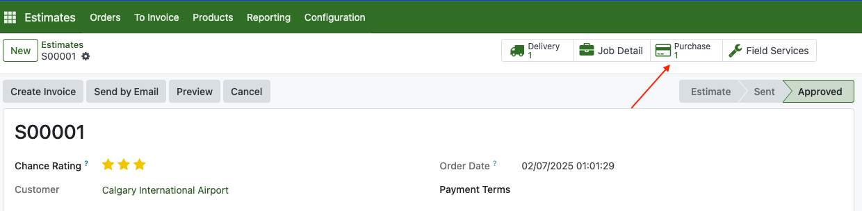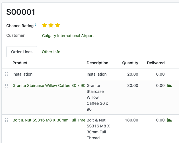 At the top, you’ll see three stars called the Chance Rating. This indicates how confident you are that the estimate will close the deal. If you select three stars, once the estimate is validated, any unavailable products will be automatically ordered from the assigned vendor.