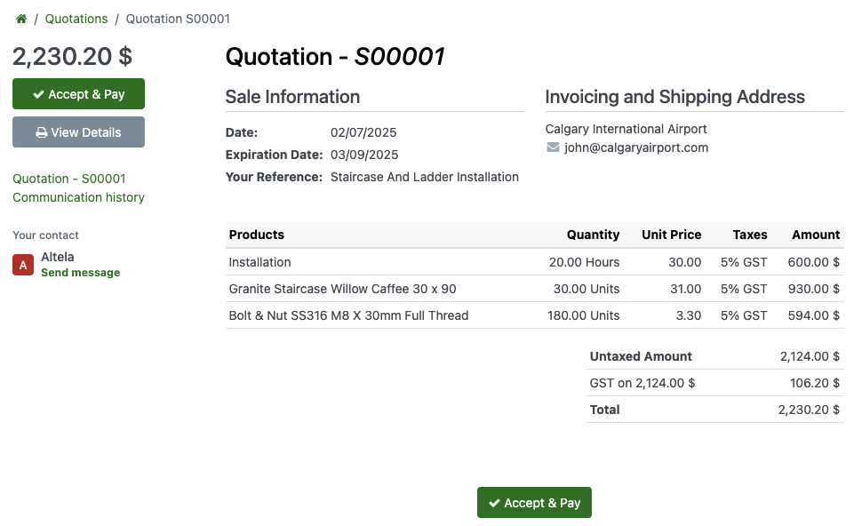To send an invoice, click the Send & Print button. If the Stripe payment gateway is enabled, customers can pay the invoice online. Any previous installment payments will be reflected in the Total Amount section.