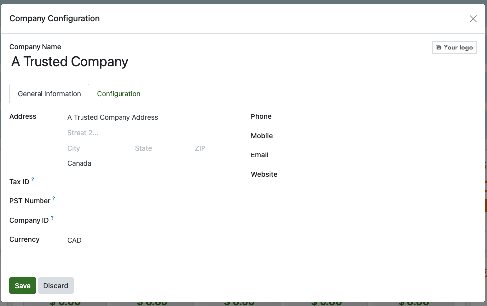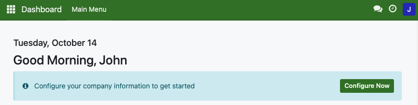 From the main dashboard, you’ll see a blue banner prompting you to set up your company. Click Configure Now to begin.