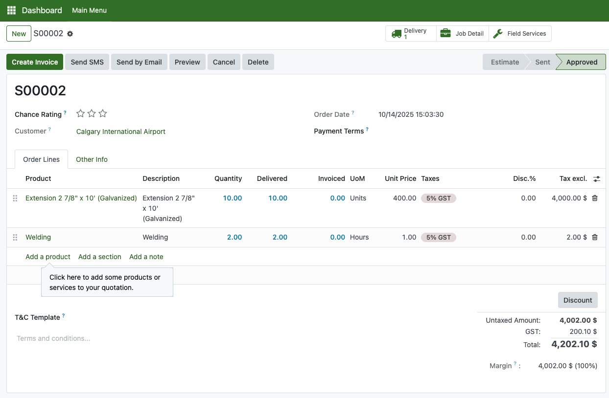 When a Field Service is validated, the Jobs to Invoice status will appear on your dashboard. Click to open lists of all the job that needs to be invoiced