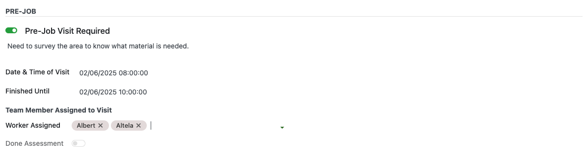 If an initial site visit is required, you can schedule a Pre-Job by activating the toggle button. Enter the visit date, any notes, and assign the team member responsible for the visit.