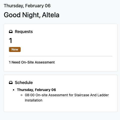 Once you save this record using the Save button at the top, all tagged team members will have the task added to their schedule. They can view it on their own dashboard, along with the total number of requests and how many require on-site assessments. If they cannot see it, please check the user’s permissions in the Managing Users section of the documentation.