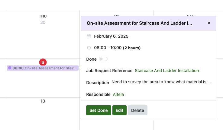 When you click on a schedule, you’ll be taken to the calendar view where all assigned activities are displayed. Click on an activity to open a pop-up, then click the Job Request Reference to see the details. You can also mark it as Done once the task is completed.